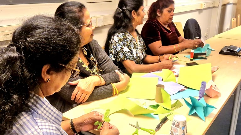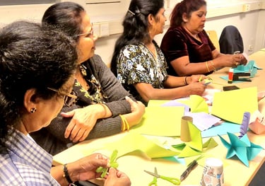 We played percussion instruments and sang wholeheartedly. When we split into groups and sang in a friendly competition with the percussion sounds echoing, our happiness knew no bounds. The purpose of this was to help women forget their worries and reduce stress through a psychological approach. We played indoor games. We played to keep our bodies healthy, and through this, our physical well-being improved. We made handicrafts using paper and revived memories of life in the olden days. The reason for this is that giving the brain such tasks can help improve their memory power.